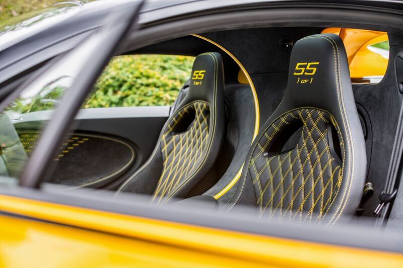 Atrás, el alerón reza “55 1 of 1″, indicando lo especial de este Chiron. Misma inscripción que adorna la tapa de combustible y los apoyacabezas en la cabina, vestida con cuero predominantemente negro con costuras amarillas en patrón de diamante.