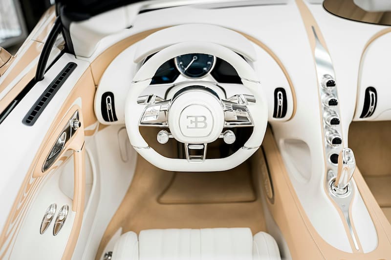 Pero en La Perle Rare el protagonismo no está solo bajo el capó. Su carrocería luce un acabado nacarado bicolor de enorme complejidad técnica: un blanco cálido en la zona inferior y un dorado perlado en la superior, unidos por delicadas líneas pintadas a mano que evocan reflejos en movimiento.