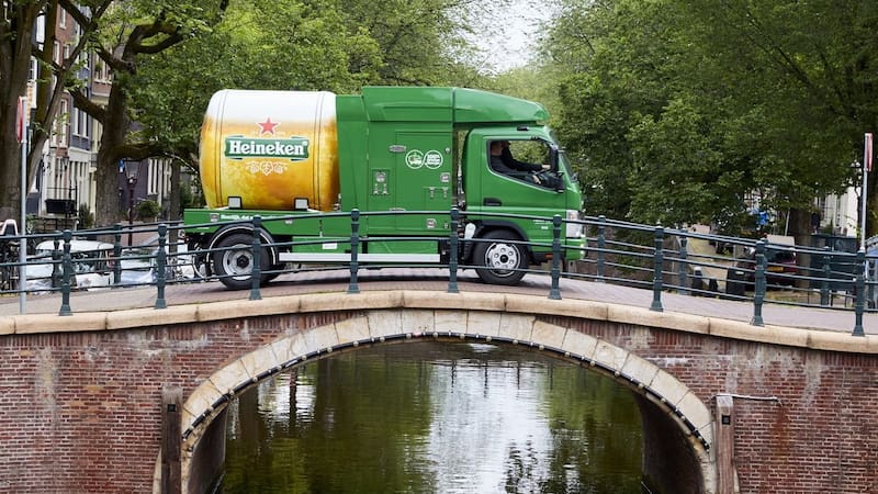 Con la colaboración de otras empresas especialistas, la compañía cervecera neerlandesa toma como base uno de los modelos eléctricos del Grupo Daimler, el Fuso eCanter, para desarrollar este exclusivo ejemplar, el cual monta un inmenso tanque cilíndrico para almacenar cerveza en bruto.