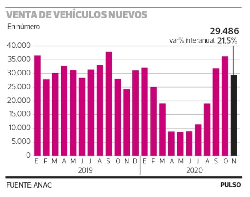 El mercado automotor nacional completó tres meses consecutivos en el orden de los 30 mil autos nuevos vendidos, según informó este miércoles la Asociación Nacional Automotriz (Anac). Noviembre registró un total de 29.486 facturaciones, una cifra si bien inferior a las 36.243 de octubre pasado, que igualmente representa un avance interanual del 21,5% (comparados noviembre 2019 -estallido social de por medio- y noviembre 2020).