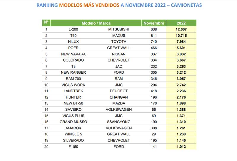 A continuación, las 20 camionetas más vendidas en Chile hasta el 31 de noviembre: