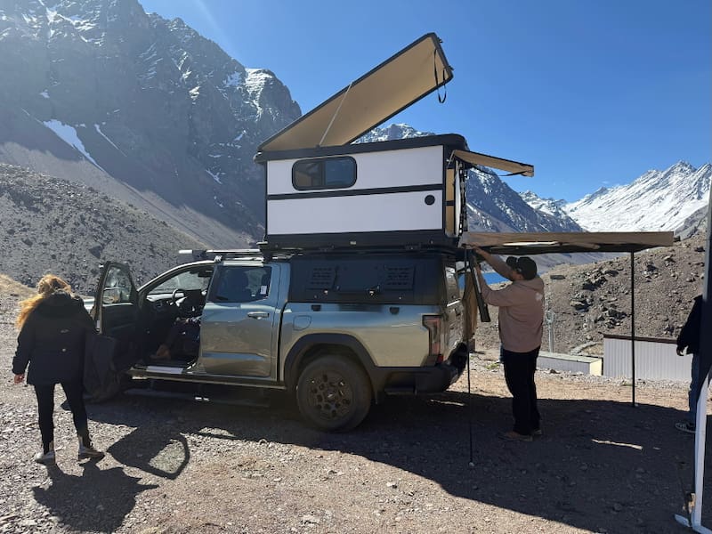 El portaequipajes de techo, construido en aleación de aluminio, es clave para garantizar estabilidad y seguridad en terrenos irregulares. A diferencia de soluciones convencionales, el sistema de la Himla utiliza interfaces estandarizadas que aseguran una fijación precisa entre la cubierta, la tienda y los accesorios, convirtiendo a la camioneta en una plataforma modular, sólida y completamente personalizable.