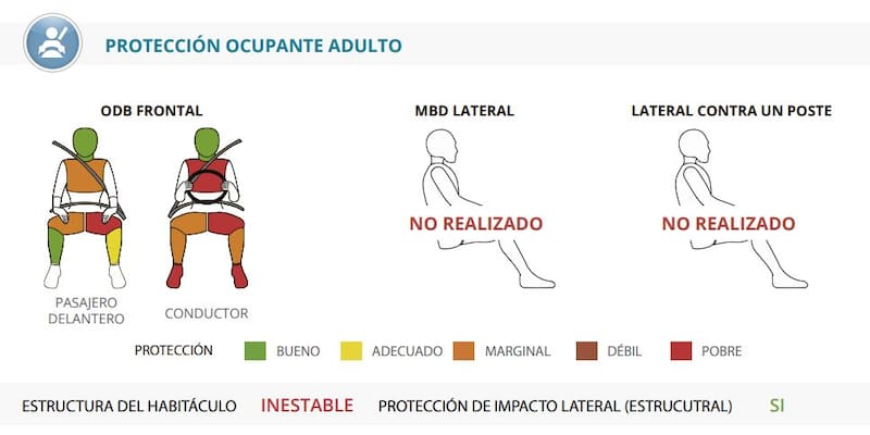 El informe de Latin NCAP establece que en "el pecho del conductor se ofreció protección pobre excediendo los límites permitidos en el test y llevando al vehículo a obtener cero estrellas para protección de ocupante adulto". Asimismo, la prueba de impacto lateral finalmente no fue realizado "porque el vehículo en el test de impacto frontal excedió en los límites biomecánicos máximos, lo que llevó a un resultado inmediato de cero estrellas".