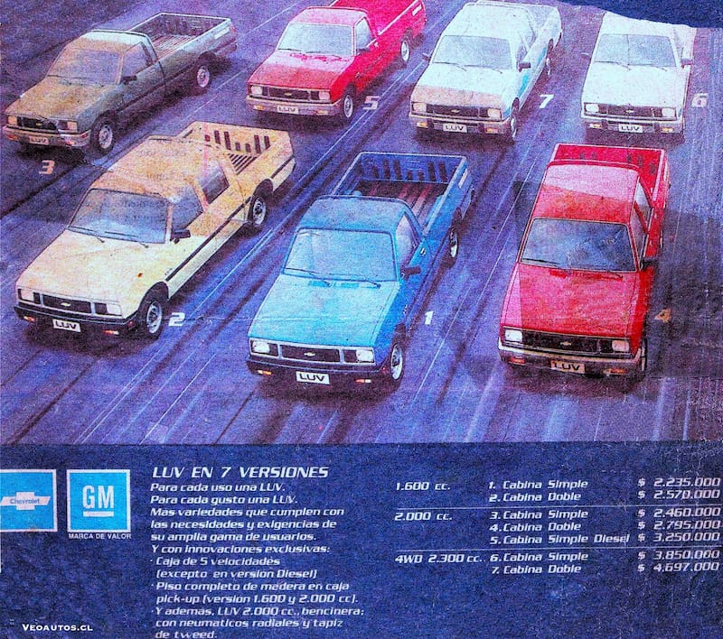 Destacaba por un equipamiento que incluía aire acondicionado, cierre centralizado, alzavidrios y espejos eléctricos y llantas de aleación. Su éxito en Chile fue tal que en tres meses puso en las calles 1.898 unidades. Tal como puedes ver a continuación, la camioneta era comercializada con el eslógan ‘Chevrolet LUV, en el corazón de todo Chile’.