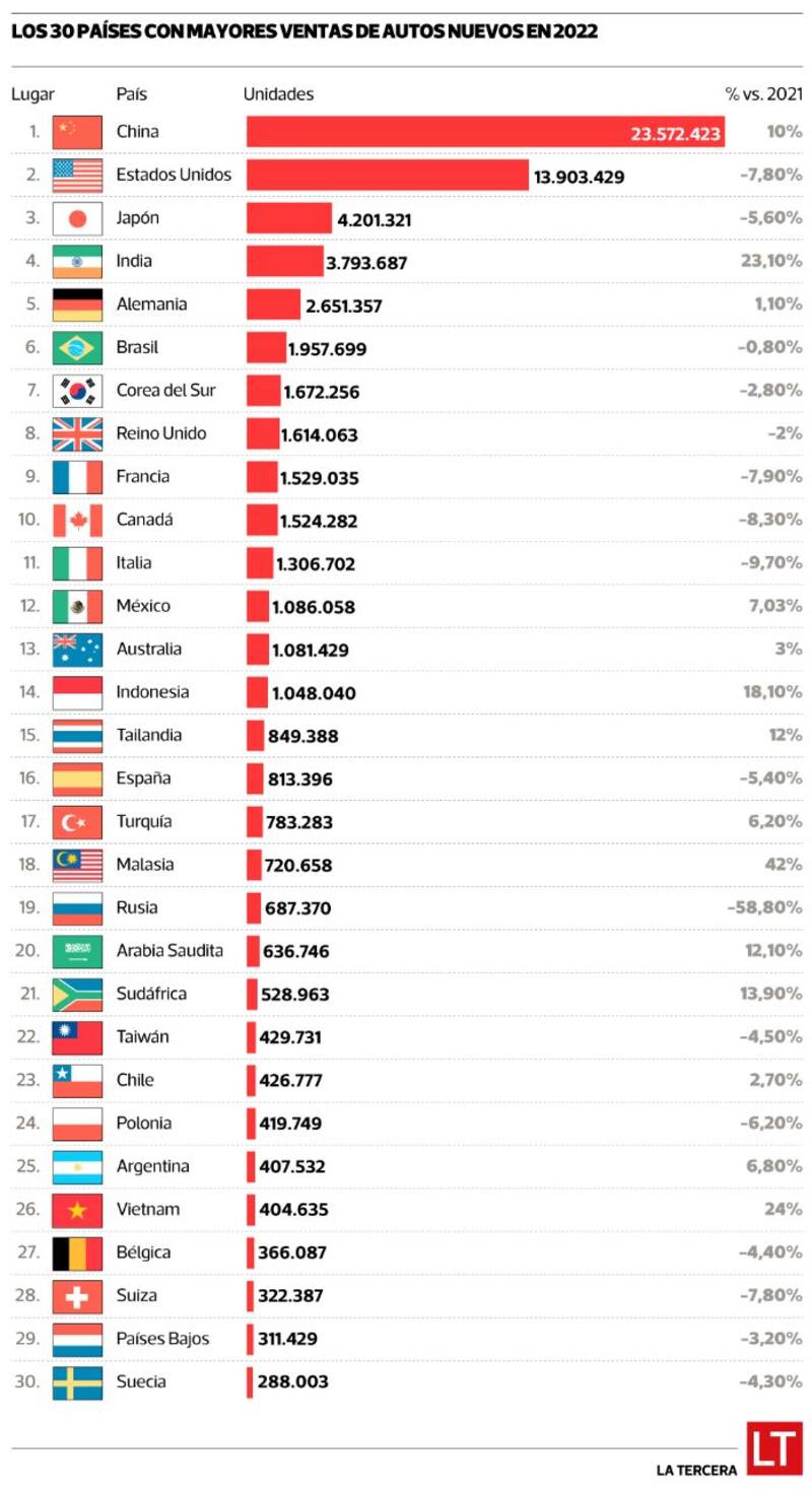 Según información que reunió el equipo MT Motores desde las organizaciones que reúnen a las marcas en algunos países (similar a lo que es la ANAC en Chile), además de información de sitios especializados como focus2.move y statista.com, entre otros que reúnen datos de venta de vehículos, tal como los últimos años el listado sigue liderado a enorme distancia por China, que en 2022 vendión más de 23,5 millones de unidades en su mercado local, lo que representó un alza del 10% en comparación con el mismo ejercicio anterior.