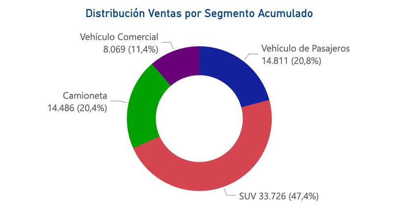 En este contexto, el segmento de SUV no sólo sigue siendo el más relevante del mercado local con 47,4% del total, además es el que exhibe el menor descenso en comparación a Pasajeros, Camionetas y Comerciales.