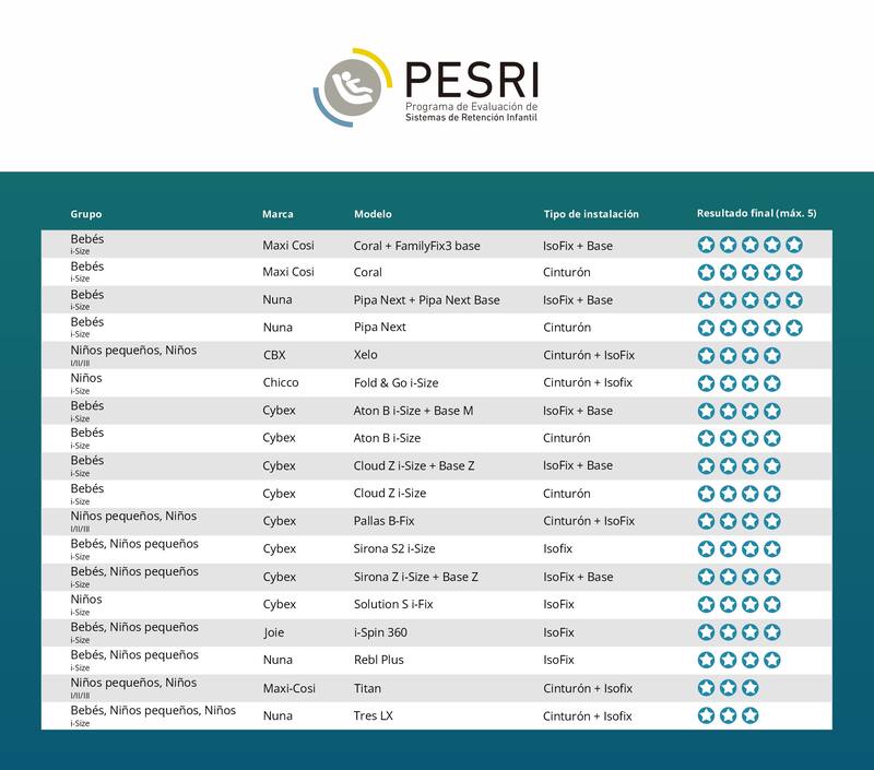 Las pruebas incluyeron cuatro modelos de portabebés, cuatro modelos convertibles para bebés o niños, cuatro sillas multigrupo (que se pueden usar tanto en modo integral como en booster) y dos boosters con respaldo.