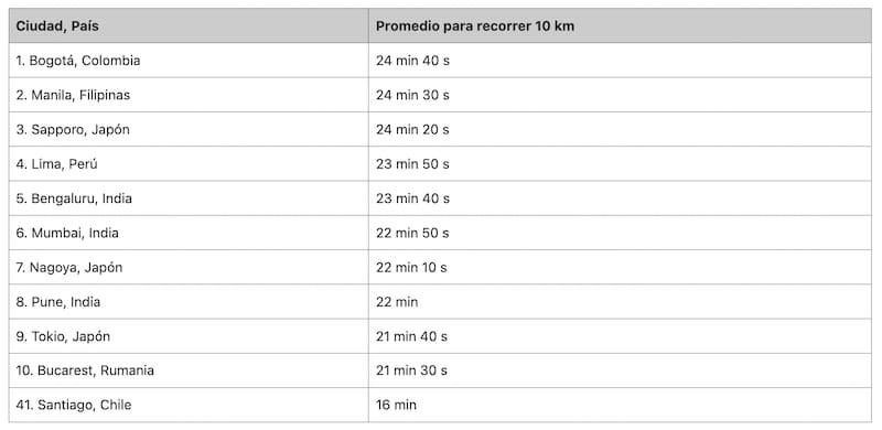 Según el registro, en Bogotá los conductores demoran 24 minutos y 40 segundos en recorrer 10 kilómetros con un promedio de 19 km/h, mientras en Santiago se necesitan 16 minutos para cubrir la misma distancia, a una velocidad media de 31 km/h.