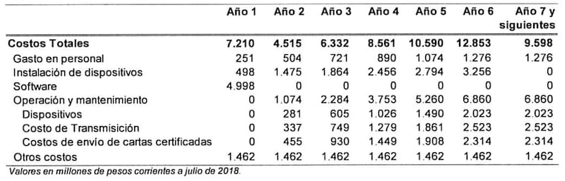 El documento agrega que “desde el año 7 en adelante no se consideran nuevos dispositivos a instalar. De este modo, el costo de instalación de dispositivos cambia con la cantidad de nuevos dispositivos instalados (incremental cinemómetros). En el segundo año, se instala una cantidad de 38 nuevos dispositivos, lo que supone un costo de instalación equivalente a $1.475 millones de pesos. Esa cifra se sigue incrementando hasta llegar a $3.256 millones en el año 6, cuando se instalan 78 nuevos dispositivos. Cabe señalar que el primer año considera un gasto de 498 millones dentro del concepto “instalación de dispositivos”, pese a que en tal año no se instalan dispositivos, pues se considera un costo de hardware a realizarse el primer año y por una sola vez”.