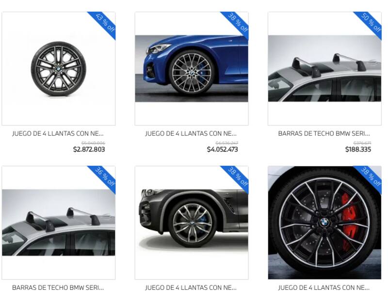 En este listado la lista es enorme y se puede encontrar desde juegos de llantas, carcasas para espejos laterales, logos para llantas ybarras de techo hasta pisos de goma y aromatizadores.