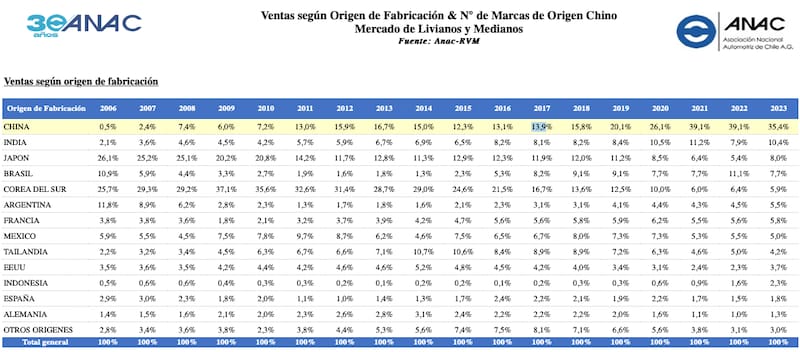 Según informes de la Asociación Nacional Aumotriz de Chile (Anac), el origen chino -contando los modelos construidos en China de marcas como Chevrolet, Ford, Volvo o BMW- es por lejos desde donde más se importan autos, aunque de todas maneras evidenció un retroceso el año pasado frente al mismo ejercicio de 2022.