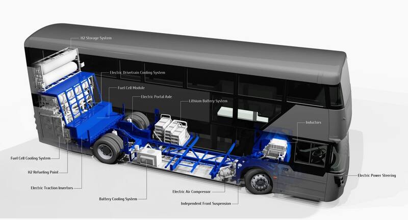 El autobús en cuestión es fabricado por Wrightbus y puede almacenar 25 kg de hidrógeno a presión en varios depósitos cilíndricos ubicados en la parte trasera. Estos depósitos permiten una autonomía ligeramente superior a 400 kilómetros, según el fabricante. La estación de recarga permitirá recargar cada autobús en unos cinco minutos, tiempo similar al repostaje de un autobús diésel.