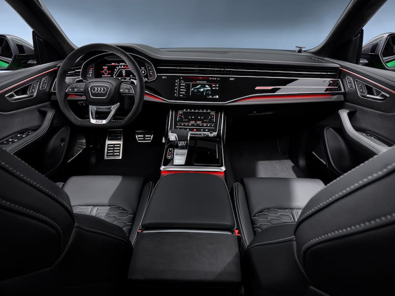 Por dentro, el RS Q8 dispone de techo y detalles interiores en Alcantara, una atmósfera sport también adornada con detalles en Carbon Twill. Los asientos deportivos son de cuero cuero Valcona perforado con costuras en forma de rombos, que amoldan perfectamente a los ocupantes. Además, tienen función de masaje, memoria y son calefaccionados.