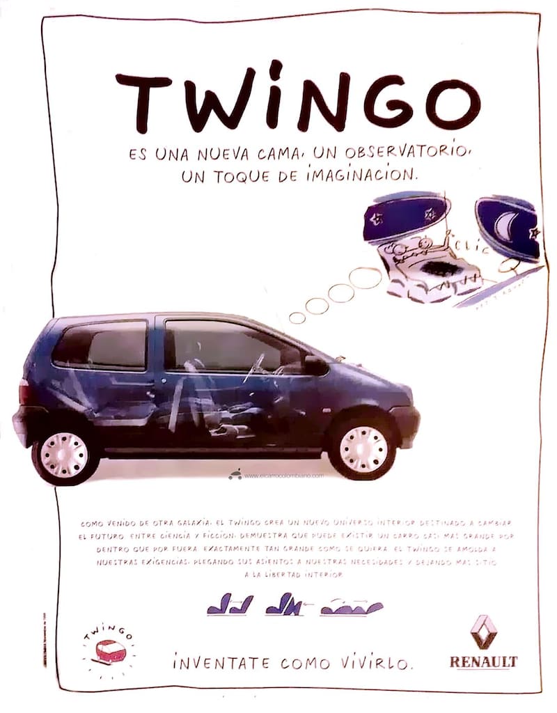 Por aquellos años, la firma del rombo se enorgullecía por un nuevo producto de fabricación local. El Twingo debutaba con grandes aspiraciones, con un estilo muy juvenil y con una agresiva campaña de publicidad en la que se le veía haciendo piruetas en dos ruedas. También se resaltaba el amplio espacio interior y los asientos que se convertían en verdaderas cama.