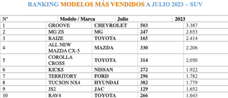 Ahora bien, en el top ten de los SUVs más vendidos, nos encontramos en el primer lugar con el Chevrolet Groove -fabricado también en China-, con 3.387 ejemplares. Le siguen el MG ZS, con 2.653 unidades matriculadas hasta la fecha y el Toyota Raize con 2.414 colocaciones.