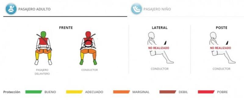 La protección para ocupante infantil, en tanto, se explica por las altas lecturas de los muñecos de prueba durante la prueba de choque y la falta de instrucciones adecuadas para la instalación correcta de los sistemas de retención infantil. Ya que el resultado del test de choque frontal fue de cero estrellas, no se realizó la prueba de impacto lateral.