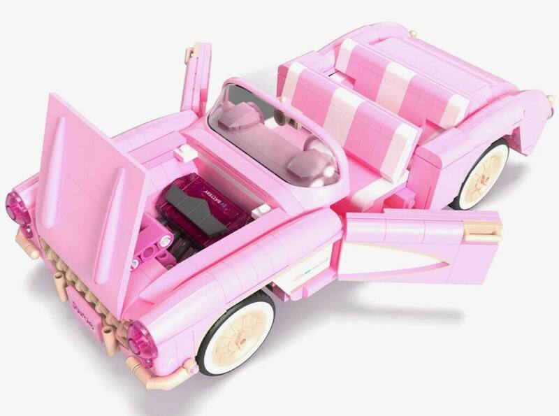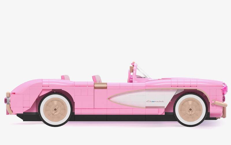 En este caso, el Barbie Corvette de 1956 está compuesto por 805 bloques que junto a su carrocería rosa luce clásicos neumáticos con banda blanca. Además, las puertas son móviles, y cuenta con suspensión ajustable y un portalón trasero plegable. También tiene patines en línea y un motor eléctrico.