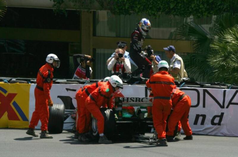 Poco después del golpe de Klien la atención de la carrera se desvió a otro punto, la zona de Tabac. Allí Takuma Sato rompió su motor Honda formado una inmensa nube de humo. Giancarlo Fisichella se llevó por delante a David Coulthard y quedó volcado en mitad de la pista, provocando la neutralización de la prueba y el destrozo general de las protecciones. Todos los comisarios miraron hacia allá, o casi todos.