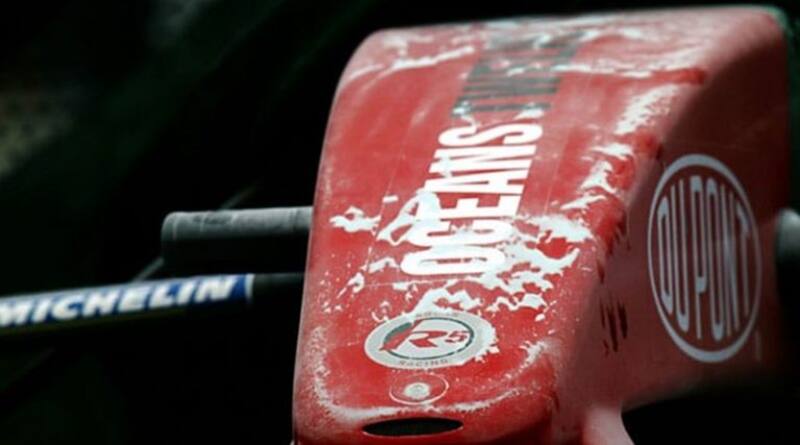 Aquí es cuando llegamos al momento delicado, puntualmente, cuando Klien en la primera vuelta de carrera se estrella contra el muro de neumáticos de la mítica curva de Loews. Sí, con el diamante por delante, el cual entonces desapareció como por arte de magia.