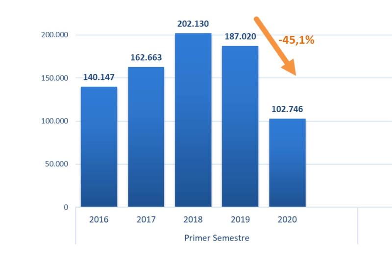 La Asociación Nacional Automotriz de Chile (ANAC) acaba de publicar su informe mensual sobre el comportamiento del mercado nacional de automóviles. El documento detalla que el primer semestre -eclipsado por la pandemia a partir de marzo- cerró con 102.746 matriculaciones, muy por debajo de las 187 mil que se registraron en la primera mitad de 2019 (la baja acumulada es del 45,1%).