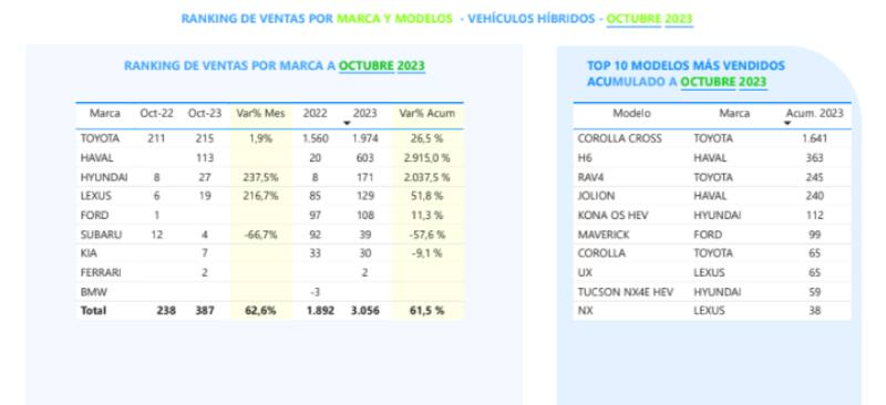 Respecto de marcas, Toyota lidera el ranking entre las ventas de híbridos, con 1.974 unidades. Bastante más atrás, le siguen Haval y Hyundai, con 603 y 171 ejemplares, respectivamente.