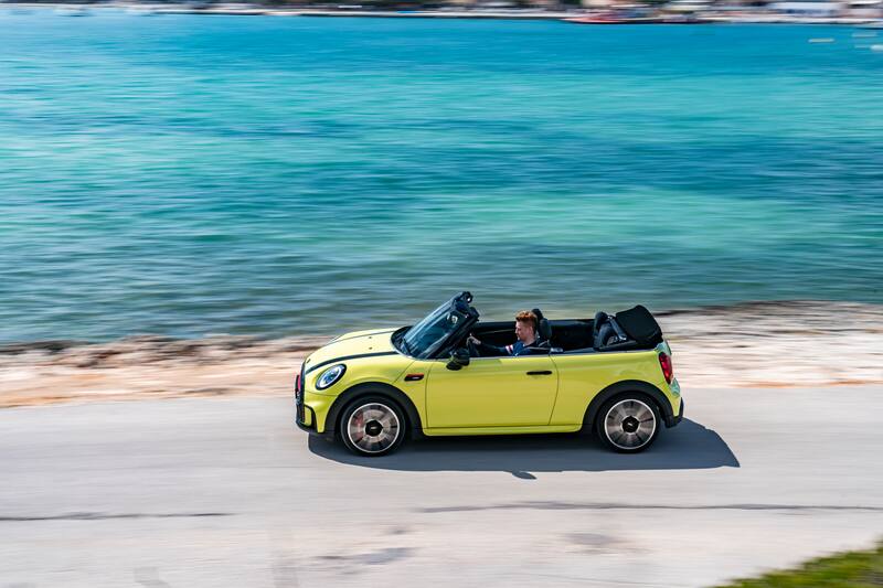 Otro detalle es que ahora el John Cooper Works Convertible -que alberga a cuatro ocupantes- se ofrece en un exclusivo tono Zesty Yellow que incorpora al parachoque delantero. Opcionalmente, esta variante tiene disponible un techo blando Mini Yours con gráficas Union Jack (el diseño de la bandera británica). Puede ser abierto hasta una velocidad máxima de 30 km/h y tarda 18 segundos en esa función. Los tubos de escape deportivos de 85 mm son también una exclusividad de esta edición.