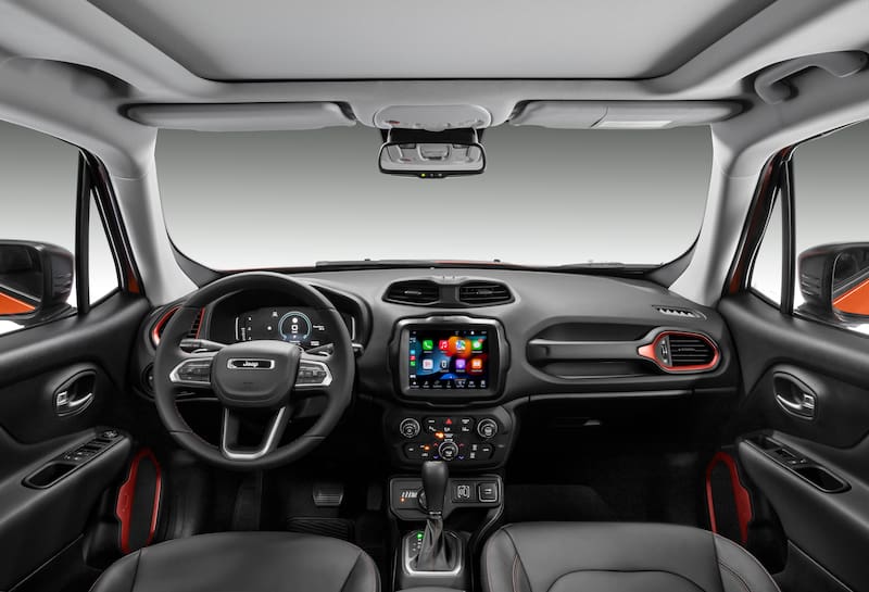 En materia de equipamiento, el Renegade brasileño innova con una pantalla central táctil de 7″ enlazable sin cables con Apple CarPlay y Android Auto (es de 8.4″ a partir del corte Longitude) y tres conectores USB (dos tipo A y uno C). Asimismo, dispone de nuevos juegos de llantas, que van entre las 17 y 19 pulgadas y faros full LED delanteros y traseros. El techo solar es opcional en los Renegade S y Trailhawk.