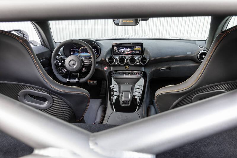 En el habitáculo encontramos cuero exclusivo Napa que se combina con la deportiva microfibra de color negro, con costuras de adorno de contraste naranja. Los asientos AMG tipo butaca de fibra de carbono combinan un peso reducido con una sujeción lateral óptima. El interior está disponible también como opción con costuras de adorno en color de contraste gris.