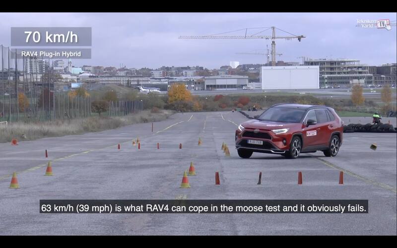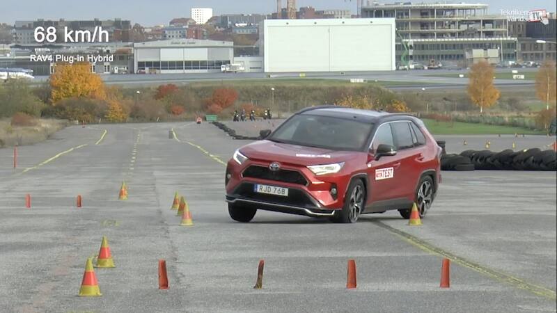 El medio escandinavo constató que el SUV no se comporta para nada bien en situaciones de riesgo. No logra mantener la línea en una esquiva de 65 km/h o más, golpeando los conos que en una situación real podrían ser otros vehículos, un barranco o una acera. El Toyota RAV4 PHEV solo pasa la prueba a una máxima de 63 km/h.