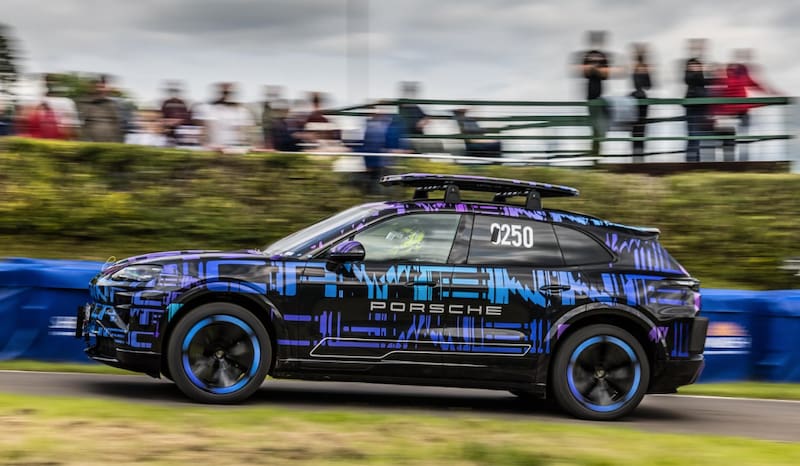 Con un disfraz en azul y violeta, el nuevo Porsche Cayenne eléctrico se ha dejado ver en la histórica subida a la colina Shelsley Walsh de Inglaterra, donde se impuso frente a un Mitsubishi Lancer EVO y un Subaru WRX con un cronómetro de apenas 31,28 segundos.