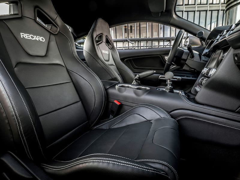 El interior destaca por un panel de instrumentos Dark Spindrift exclusivo con detalles de aluminio y asientos de cuero en color negro con una delicada línea heredada de los Mach 1. Otras mejoras son los nuevos marcos de puertas, una pantalla LCD de 12.3 pulgadas y un distintivo emblema grabado con el número de chasis del automóvil, demostrando toda su exclusividad.