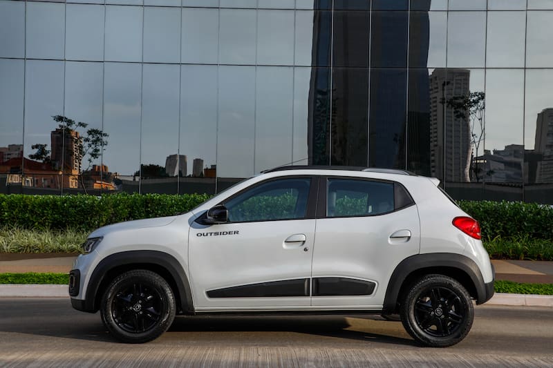 La variante tope de gama, el Kwid Outsider, complementa con tapiz con ecocuero en las zonas laterales, aplicaciones café en el pomo, el volante y los paneles de las puertas, cámara de retroceso, espejos color negro brillante, ruedas de 14″ tono dark, barras de techo longitudinales, bumpers delantero, lateral y trasero y protector de cárter.
