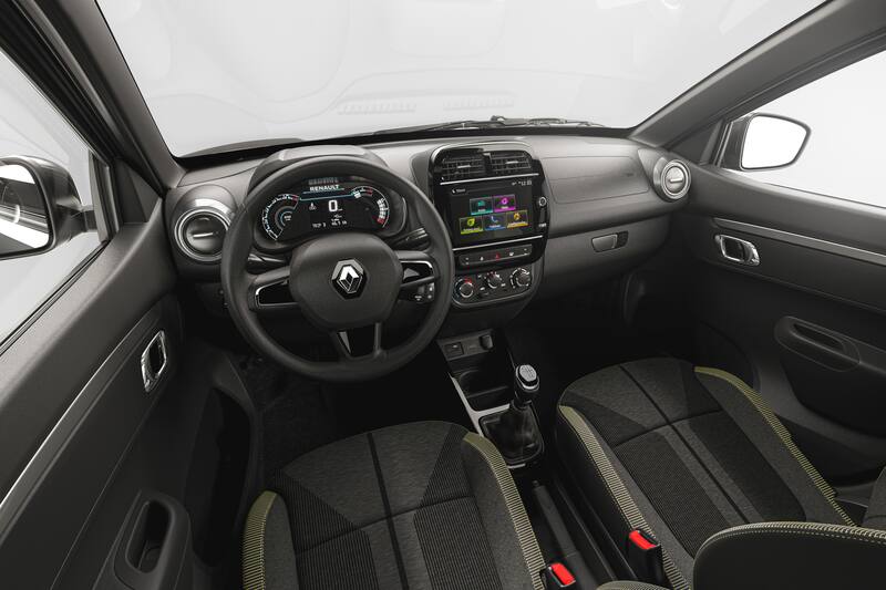 Puertas adentro, todas las versiones del Kwid hecho en Brasil cuentan con panel de instrumentos digital y a partir del corte Intense se agrega pantalla de infoentretención táctil de 8″, compatible con Android Auto y Apple CarPlay. Esta central reemplaza al antiguo display de 7” y sin perilla (solo con botones), innovando también con la integración de la tecla push to talk para ordenar diversas acciones mediante voz.