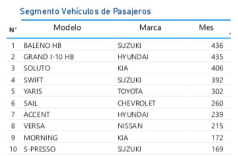 En tercera posición, se ubicó el sedán Kia Soluto con 406 unidades. La firma coreana también logró inscribir en el Top 10 al popular Morning, que se quedó con la novena posición, tras vender 172 unidades.