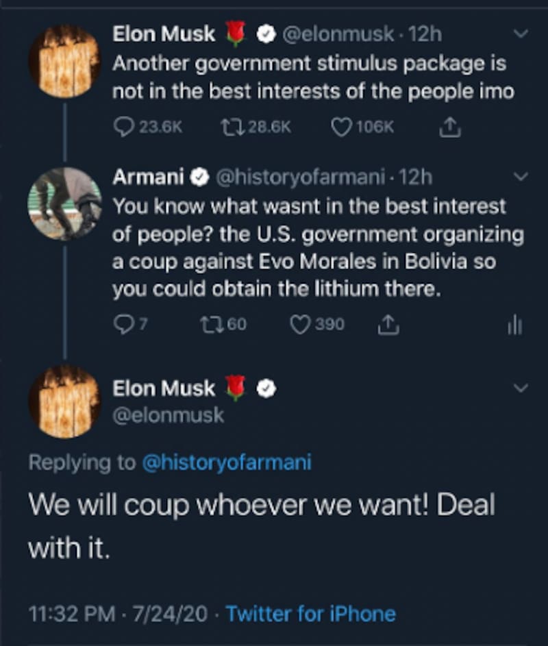 Musk mostró su molestia con acciones del gobierno de Donald Trump, las que, según su parecer, no beneficiarán a las personas. Al decir eso, un usuario (@historyofarmani) le recordó una situación de política internacional en la que se habría visto beneficiada la compañía Tesla. “¿Sabes qué no es en beneficio de la gente?. El golpe de Estado en Bolivia contra Evo Morales, organizado por el gobierno de Estados Unidos para que tú pudieras obtener su litio”, dijo el cibernauta.