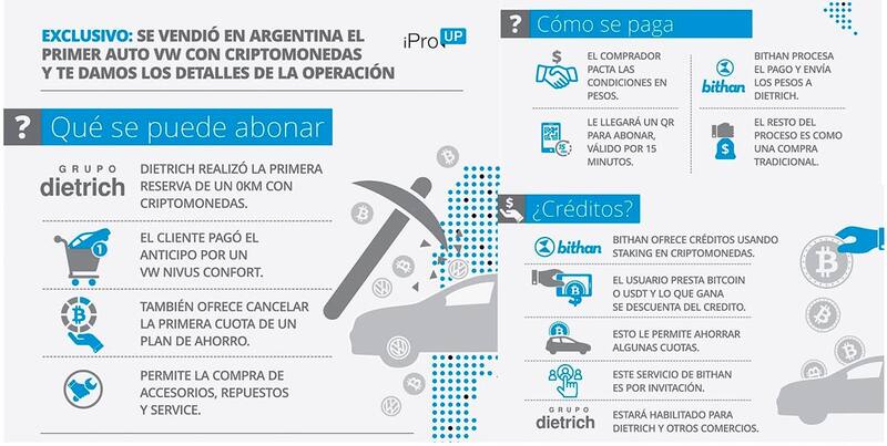 Un Volkswagen Nivus se convirtió en el primer auto reservado con criptomonedas en Argentina. Según informó el sitio iProup, la transacción del Grupo Dietrich, concesionario oficial de varias marcas en el país trasandino, se realizó a través de un sistema de venta de unidades 0 kilómetro y planes de ahorro con dinero virtual.