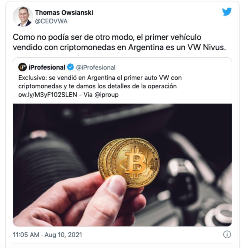 Apenas conocida la noticia, Thomas Owsianski, CEO y presidente de Volkswagen Argentina, celebró a través de Twitter que un modelo de la marca alcanzara ese logro: “Como no podía ser de otro modo, el primer vehículo vendido con criptomonedas en Argentina es un VW Nivus”, destacó el ejecutivo.