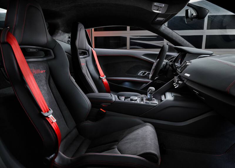 Este GT de propulsión trasera se distingue además por un traje diferencial que sigue el testigo del primer R8 GT. Equipa el Carbon Aerokit en alto brillo, con plástico reforzado en fibra de carbono para el labio delantero, los faldones laterales, el difusor trasero o el alerón, entre otros. Además todos sus emblemas van en negro, incluyendo el R8 GT que luce en la zaga.