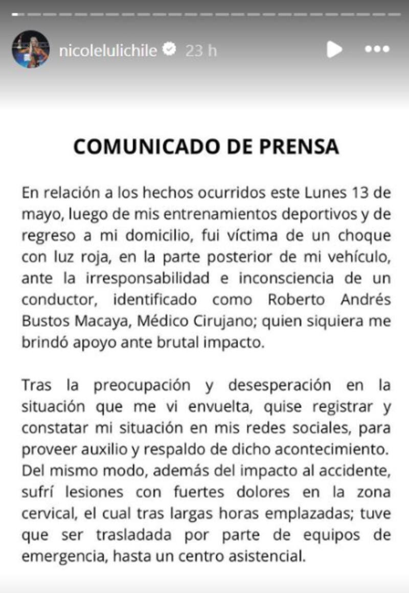 “Fui víctima de un choque con luz roja, en la parte posterior de mi vehículo, ante la irresponsabilidad e inconsciencia de un conductor identificado como Roberto Andrés Bustos Macaya, médico cirujano; quien siquiera me brindó apoyo ante el brutal impacto”, acusó Moreno.