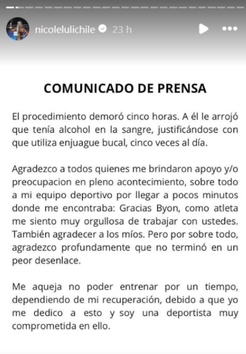 Según la influencer, “el procedimiento demoró cinco horas” y “a él le arrojó que tenía alcohol en la sangre, justificándose con que utiliza enjuague bucal, cinco veces al día”.