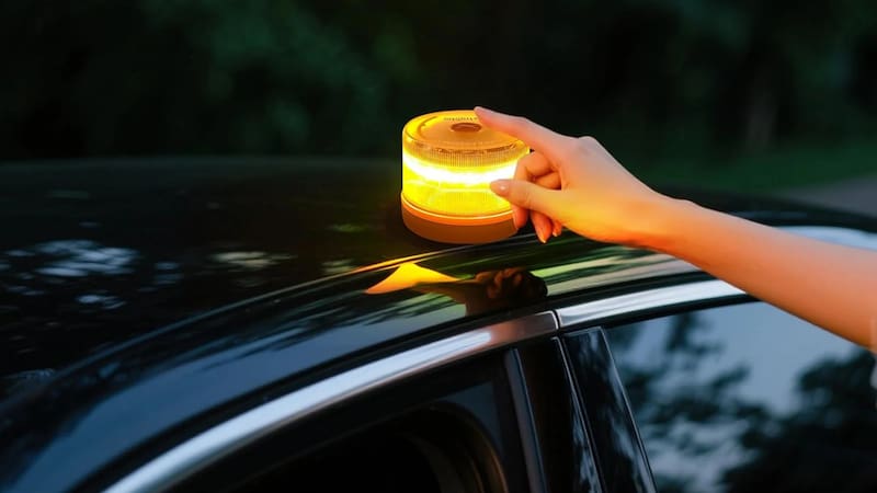 Es una luz intermitente de color amarillo que se instala en el techo del vehículo mediante una base magnética, sin necesidad de que el conductor baje del auto. Su visibilidad supera el kilómetro de distancia y cuenta con batería propia, lo que permite su uso incluso cuando el vehículo queda sin energía tras una falla o accidente.