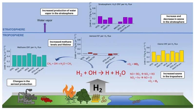 La primera observación es que los niveles de hidrógeno prolonga la vida útil del metano y, por lo tanto, una mayor abundancia del metano. Segundo, una mayor producción de ozono troposférico y cambios en el ozono estratosférico. Tercero, mayor producción de vapor de agua estratosférico. Cuatro y último, se observan cambios en la producción de ciertos aerosoles.