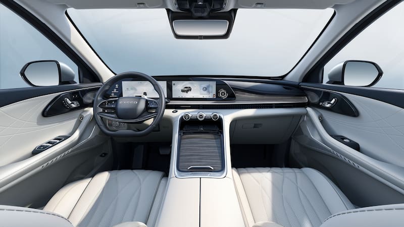 En el interior el Exeed RX pone la calidad y lujo que ya conocíamos de la marca como punta de lanza, lo que se complementa a la perfección con el nuevo diseño que presenta, muy minimalista, con una consola limpia, la palanca de cambio integrada en la columna de dirección y un tablero central dominado por la pantalla dual curva de 24,6′': una para el panel de instrumento y otra para el infoentretenimiento, cada una de 12,3″ y unidas dentro de un mismo marco y compatibles con los sistemas Apple CarPlay y Android Auto de manera inalámbrica.