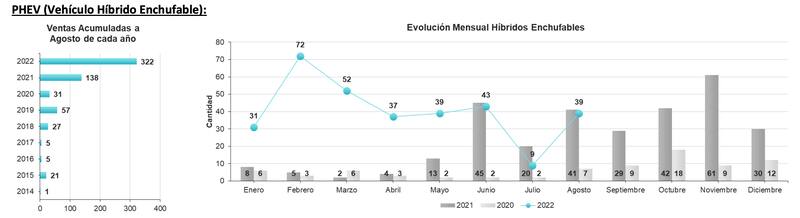 Según cifras de la Asociación Nacional Automotriz de Chile, desde que comenzó la venta de modelos eléctricos en 2011 (con el Mitsubishi i-MiEV) hasta agosto de 2022 se han vendido 1.522 vehículos 100% eléctricos (EV), a los que se suman 607 modelos híbridos Plug-In (PHEV), lo que da un total 2.129 unidades que requieren de un enchufe para la carga.