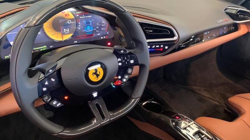 La primera unidad del 296 GTB que llegó al país, pintada del histórico color Blue Tour de France, además incluye asientos deportivos con fibra de carbono, tal como los que ocupa el SF90 Stradale.
