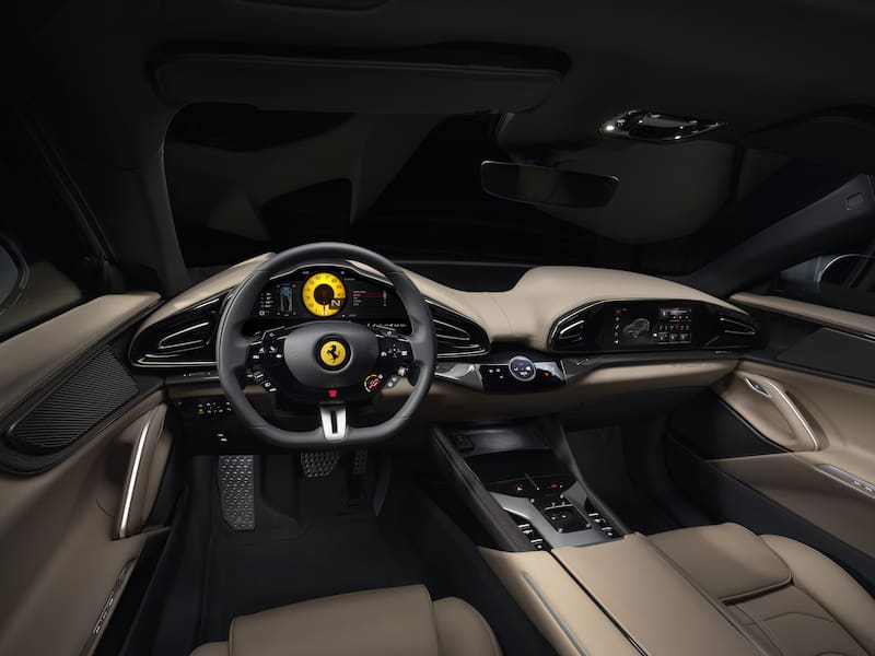 Por si fuese poco, el Purosangue es el primer Ferrari con control de descenso de pendientes. También incluye vectorización de par en el eje delantero, diferencial electrónico en el eje trasero y dirección en las cuatro ruedas, con la capacidad de que las ruedas traseras giren independientemente una de otra, para mejorar el paso en curvas, disminuir el radio de giro o incrementar su convergencia para generar una frenada más potente.