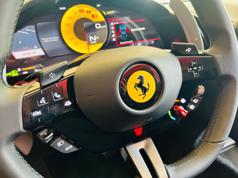 El volante tiene mandos táctiles en los radios con un aspecto ligeramente revisado en comparación con el del Roma, mientras que el botón de arranque del motor está ahora retroiluminado en rojo.