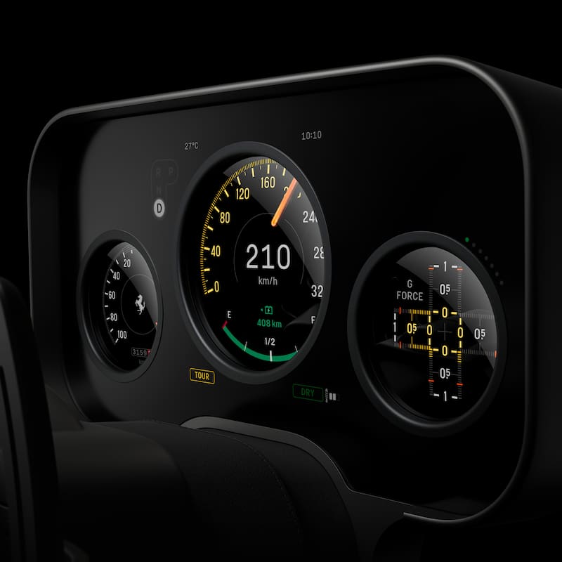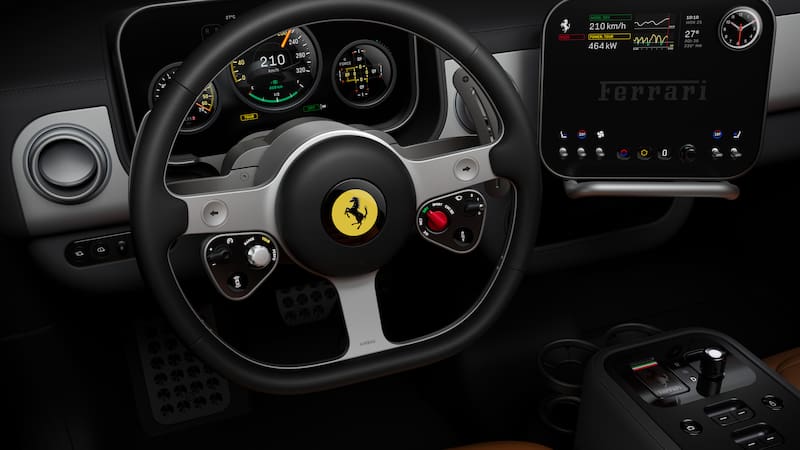 El volante retoma la clásica forma de tres radios, inspirada en modelos Ferrari de los años 50 y 60, fabricado en aluminio reciclado y con módulos de control análogos. El panel de instrumentos se mueve junto al volante y utiliza dos pantallas OLED superpuestas, desarrolladas junto a Samsung Display.