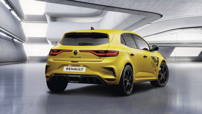 A nivel estético, el Renault Megane R.S. Ultime destaca por una carrocería más ancha, concretamente 60 milímetros en el frontal y 45 milímetros en la parte trasera, aunque mantiene rasgos como el escape central, la antena tipo ‘aleta de tiburón’, el spoiler o el difusor trasero, y añade diversos detalles en color negro (llantas, logos, marcos de ventanillas, manillas...).