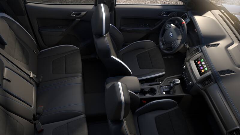 Si bien es alta para subirse, hay que decir que ayuda harto la pisadera perforada que tiene al costado por ambos lados, y tanto para la primera cabina como para la segunda. Adentro no hay mucha diferencia de diseño con la Ranger normal, exceptuando, por supuesto, los detalles de despuntes azules en los asientos, las mismas butacas -mucho más confortables y deportivas, con gran sujeción lateral y el logo Raptor bordado en el centro.